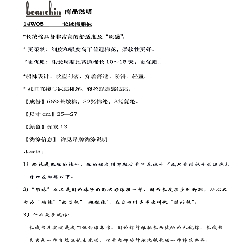 • 商品名称:长绒棉船袜14W05